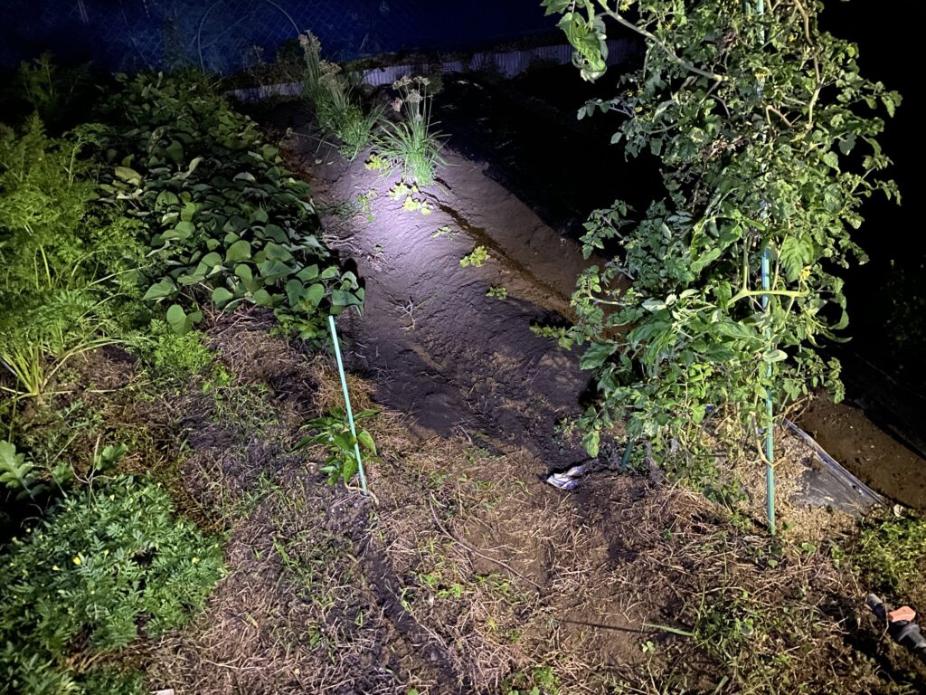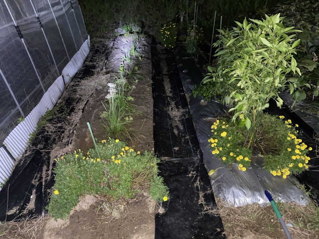 2月16日灌漑パイプ、敷設作業、埋設溝掘、取り出しパイプ接続、埋戻し、6月15日寒冷紗撤去、苦土石灰、鶏糞、籾殻、AG土力、配布、耕作、畝設置、7月13日除草、防草シート敷設、8月13日化成肥料散布、液肥散布、8月14日ニーム酢液散布、除草、9月9日液肥散布、9月14日除草、
