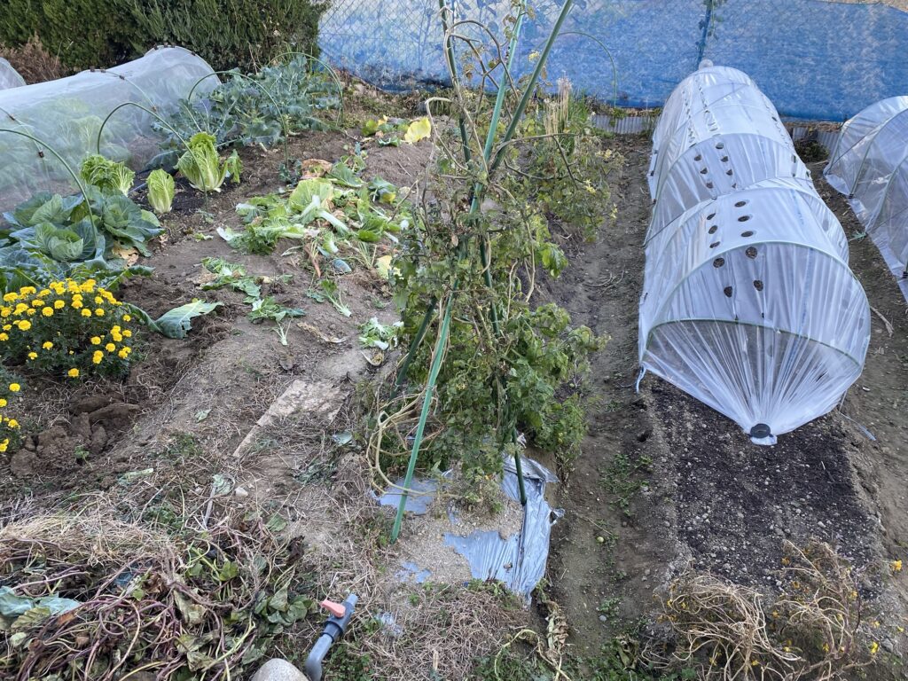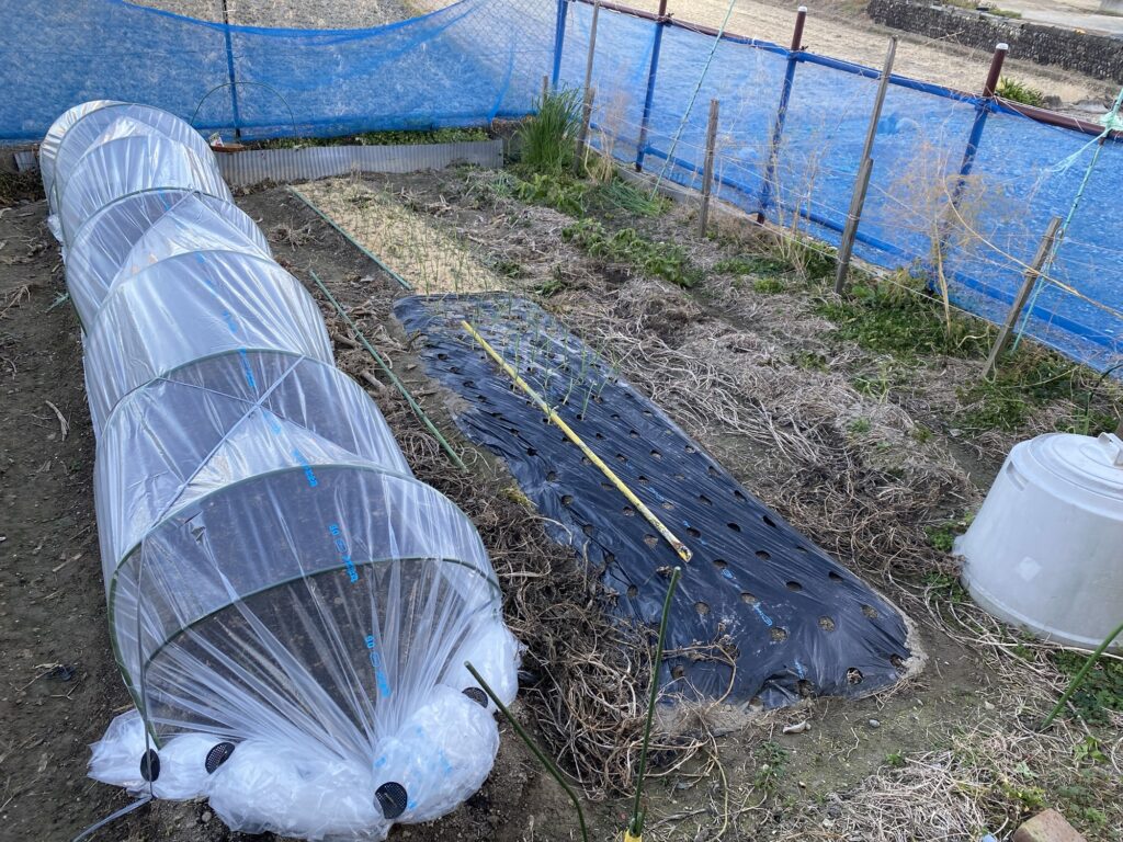 2月16日灌漑パイプ、敷設作業、埋設溝掘、取り出しパイプ接続、埋戻し、6月15日寒冷紗撤去、苦土石灰、鶏糞、籾殻、AG土力、配布、耕作、畝設置、7月13日除草、防草シート敷設、8月13日化成肥料散布、液肥散布、8月14日ニーム酢液散布、除草、9月9日液肥散布、9月14日除草、
