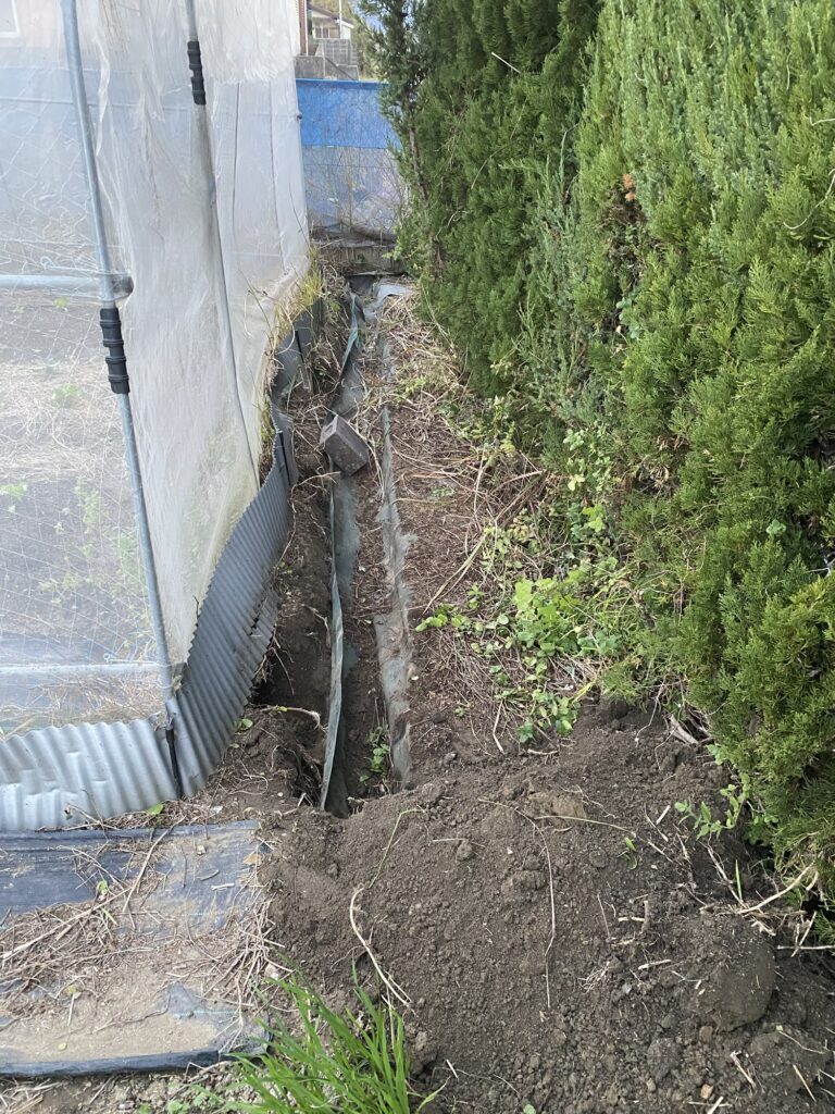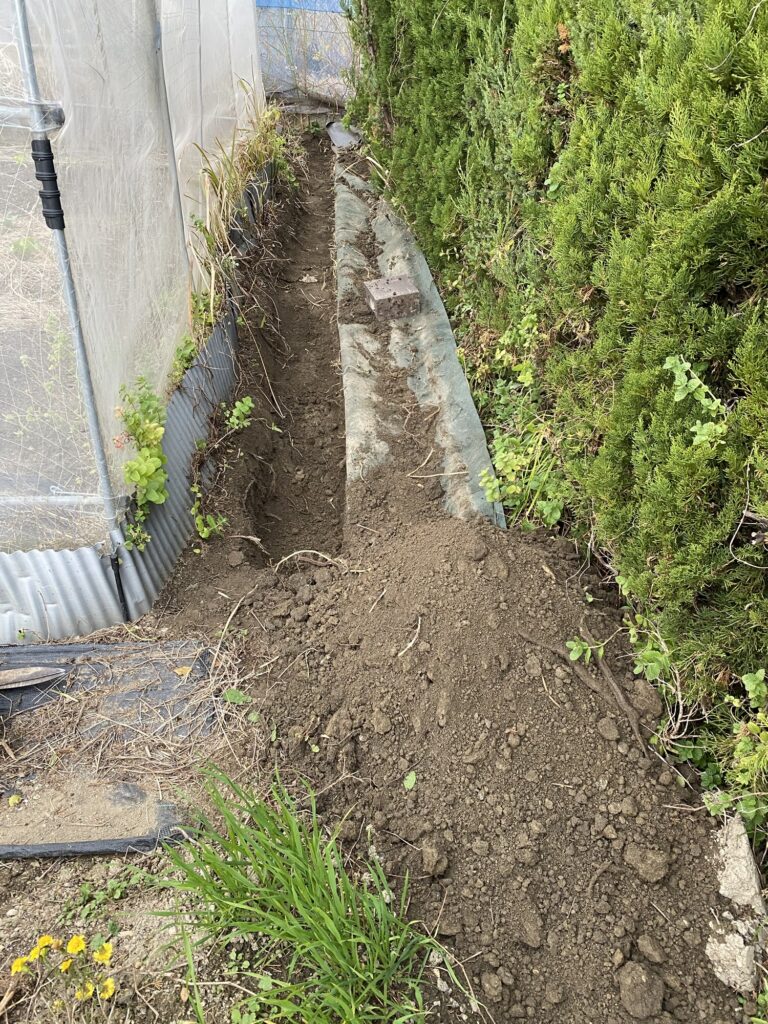 2月16日灌漑パイプ、敷設作業、埋設溝掘、取り出しパイプ接続、埋戻し、6月15日寒冷紗撤去、苦土石灰、鶏糞、籾殻、AG土力、配布、耕作、畝設置、7月13日除草、防草シート敷設、8月13日化成肥料散布、液肥散布、8月14日ニーム酢液散布、除草、9月9日液肥散布、9月14日除草、