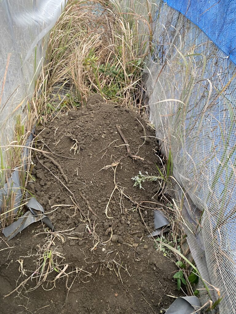 1畝立て、10月14日マルチ撤去、2畝立て、不耕起、無肥料、畝間防草シート、12月31日溝掘、除草、