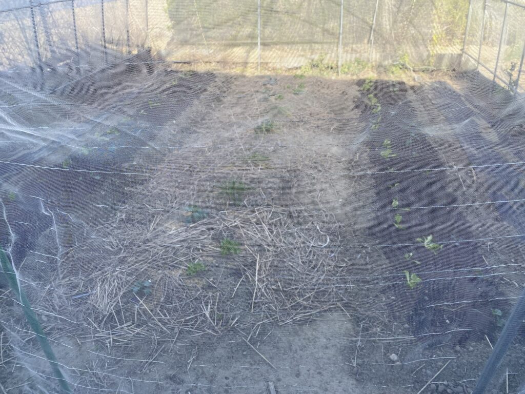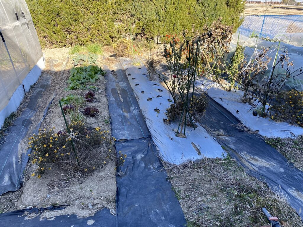 5月3日籾殻、鶏糞、牛糞、AG土力、配布、耕作、8月13日化成肥料散布、液肥散布、8月14日除草、9月9日除草、9月9日液肥散布、10月13日玉ねぎ用2畝立て、不耕起、防草シート掛け、12月31日支柱、網、不織布、設置、