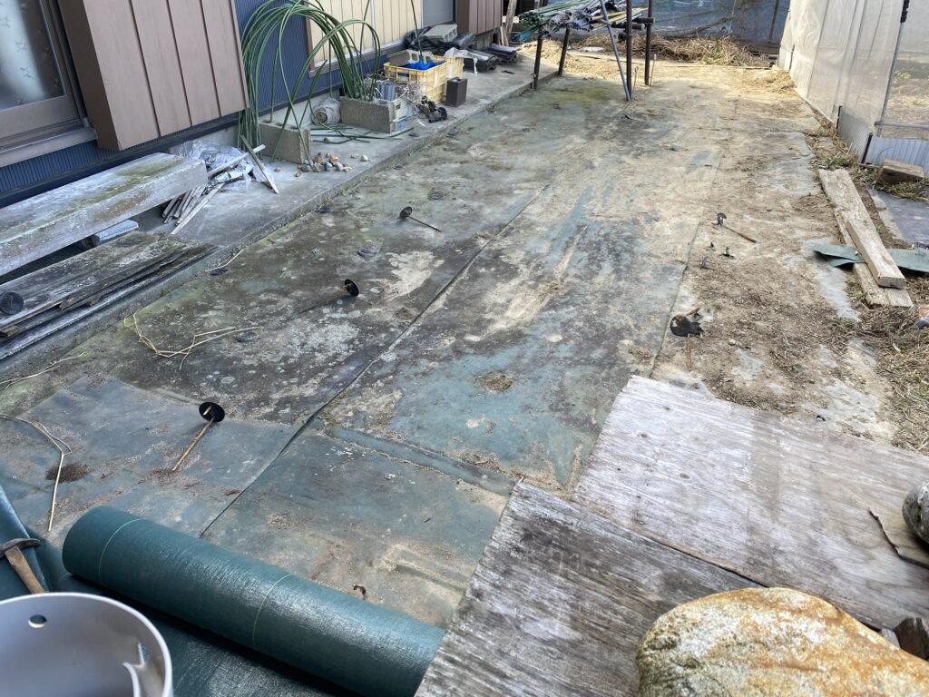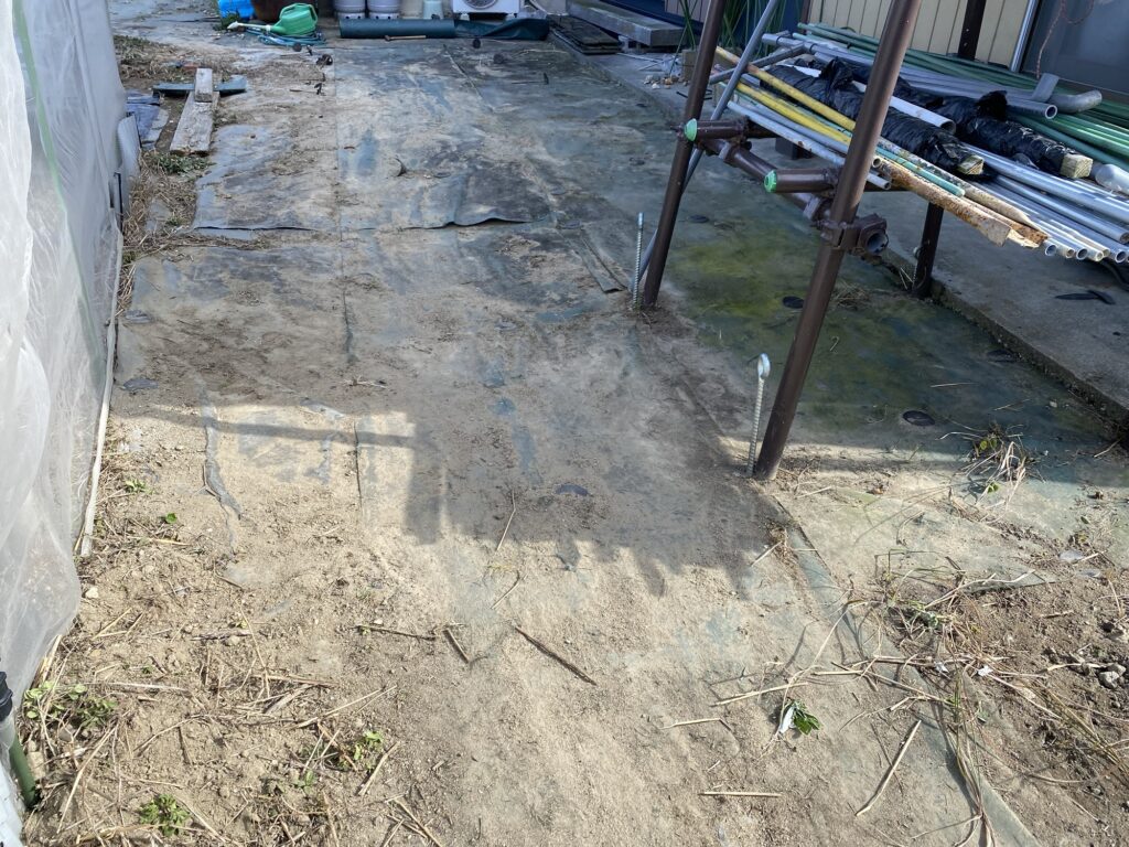 2月16日灌漑パイプ、敷設作業、埋設溝掘、取り出しパイプ接続、埋戻し、6月15日寒冷紗撤去、苦土石灰、鶏糞、籾殻、AG土力、配布、耕作、畝設置、7月13日除草、防草シート敷設、8月13日化成肥料散布、液肥散布、8月14日ニーム酢液散布、除草、9月9日液肥散布、9月14日除草、不耕起、
