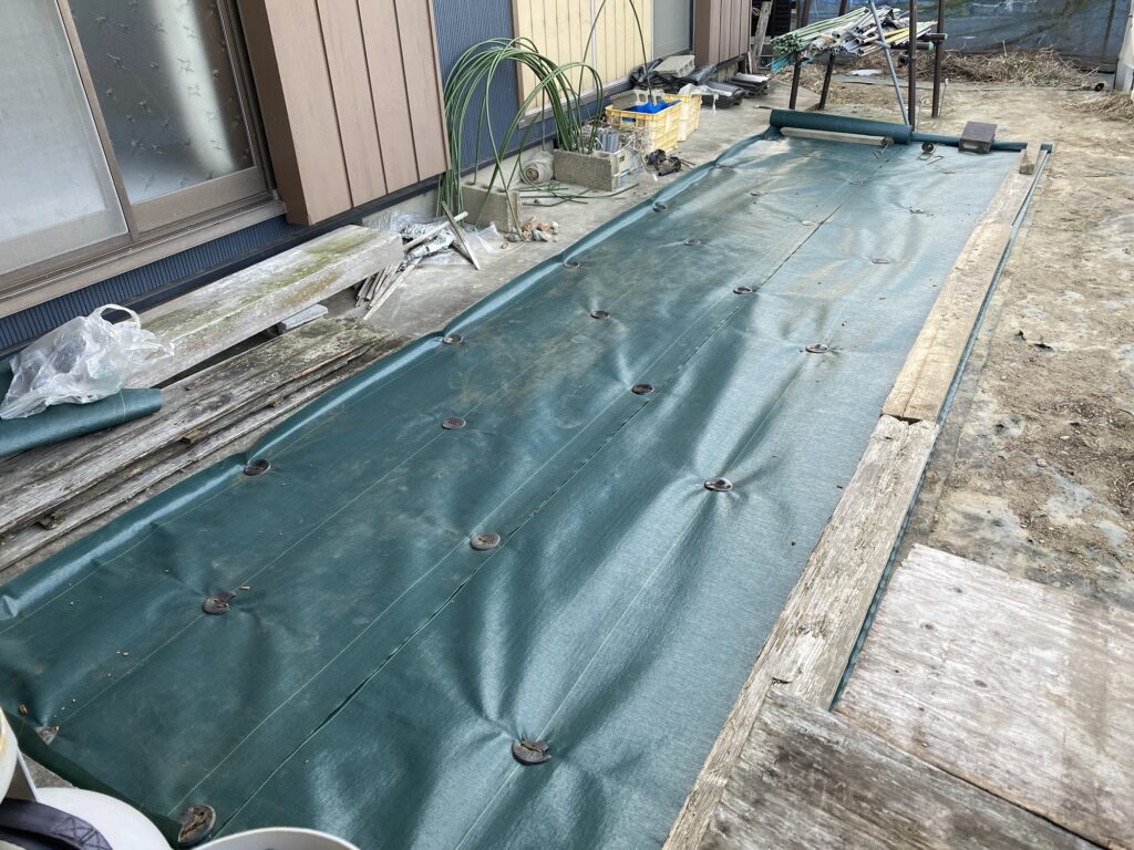 5月3日籾殻、鶏糞、牛糞、AG土力、配布、耕作、8月13日化成肥料散布、液肥散布、8月14日除草、9月9日除草、9月9日液肥散布、10月13日玉ねぎ用2畝立て、不耕起、防草シート掛け、12月31日支柱、網、不織布、設置、