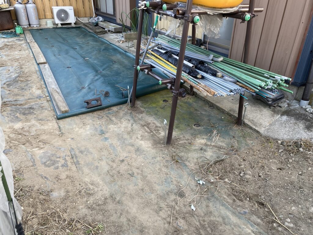2月16日灌漑パイプ、敷設作業、埋設溝掘、取り出しパイプ接続、埋戻し、6月15日寒冷紗撤去、苦土石灰、鶏糞、籾殻、AG土力、配布、耕作、畝設置、7月13日除草、防草シート敷設、8月13日化成肥料散布、液肥散布、8月14日ニーム酢液散布、除草、9月9日液肥散布、9月14日除草、不耕起、