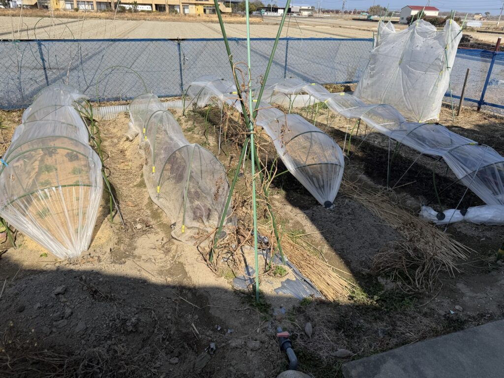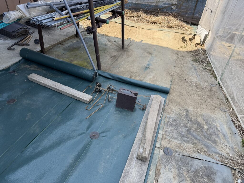 5月3日籾殻、鶏糞、牛糞、AG土力、配布、耕作、8月13日化成肥料散布、液肥散布、8月14日除草、9月9日除草、9月9日液肥散布、10月13日玉ねぎ用2畝立て、不耕起、防草シート掛け、12月31日支柱、網、不織布、設置、