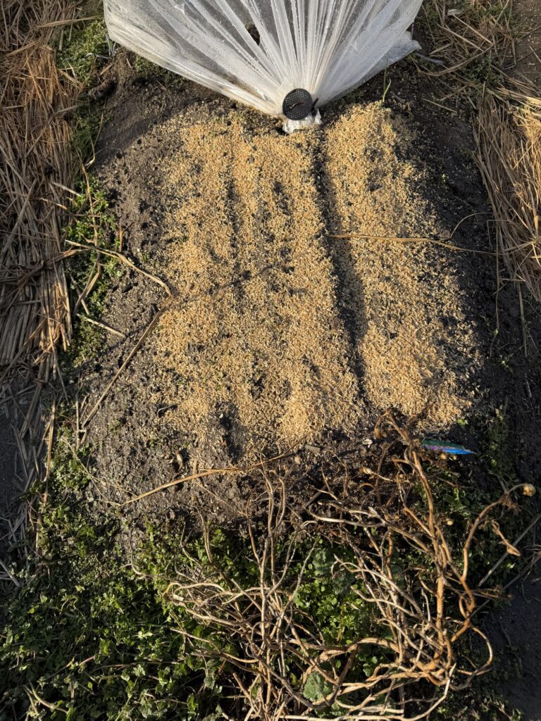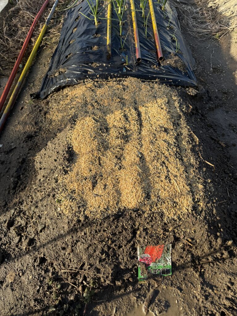 5月3日籾殻、鶏糞、牛糞、AG土力、配布、耕作、8月13日化成肥料散布、液肥散布、8月14日除草、9月9日除草、9月9日液肥散布、10月13日玉ねぎ用2畝立て、不耕起、防草シート掛け、12月31日支柱、網、不織布、設置、
