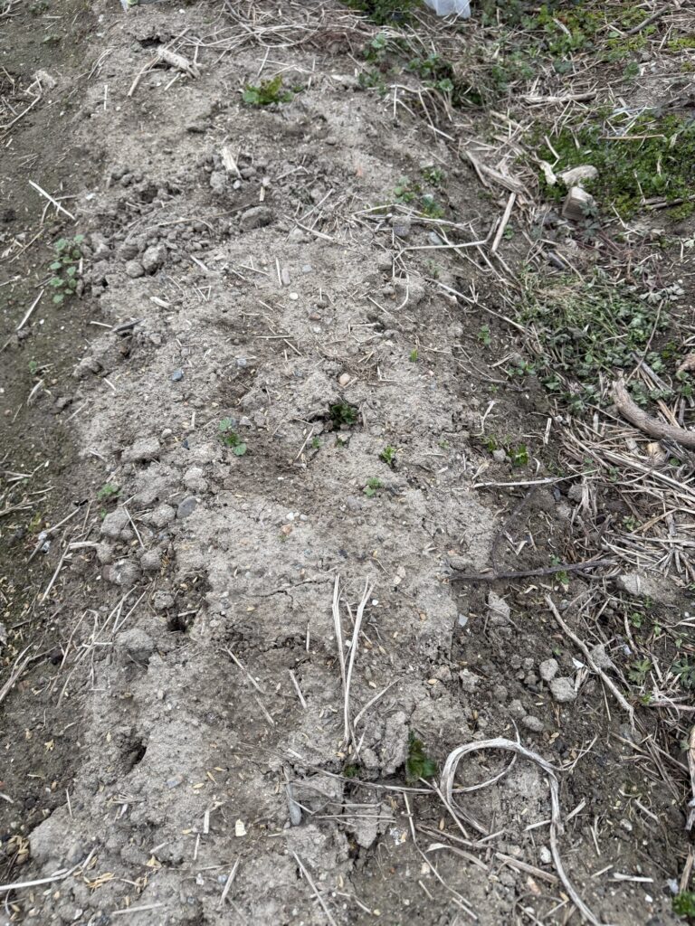 2月16日灌漑パイプ、敷設作業、埋設溝掘、取り出しパイプ接続、埋戻し、6月15日寒冷紗撤去、苦土石灰、鶏糞、籾殻、AG土力、配布、耕作、畝設置、7月13日除草、防草シート敷設、8月13日化成肥料散布、液肥散布、8月14日ニーム酢液散布、除草、9月9日液肥散布、9月14日除草、不耕起、