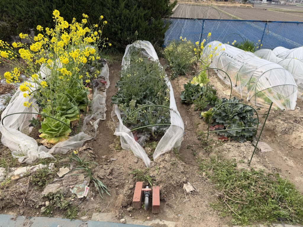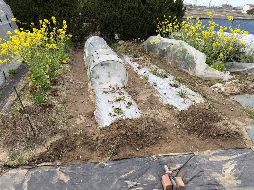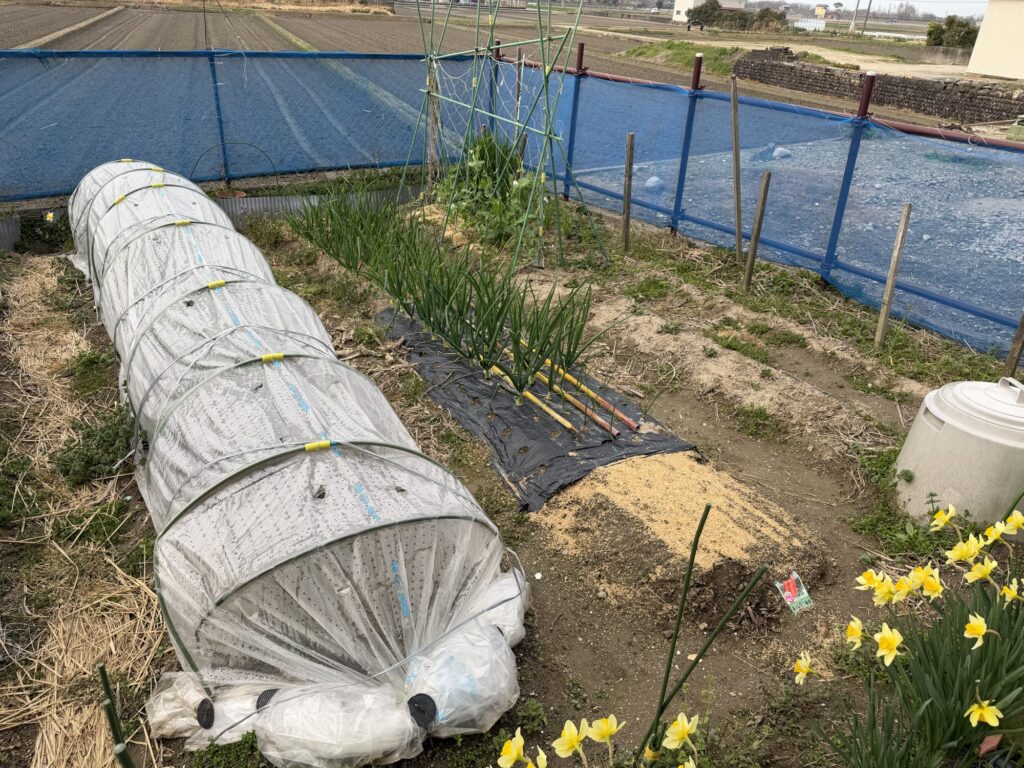 5月3日籾殻、鶏糞、牛糞、AG土力、配布、耕作、8月13日化成肥料散布、液肥散布、8月14日除草、9月9日除草、9月9日液肥散布、10月13日玉ねぎ用2畝立て、不耕起、防草シート掛け、12月31日支柱、網、不織布、設置、3月29日不織布、撤去、