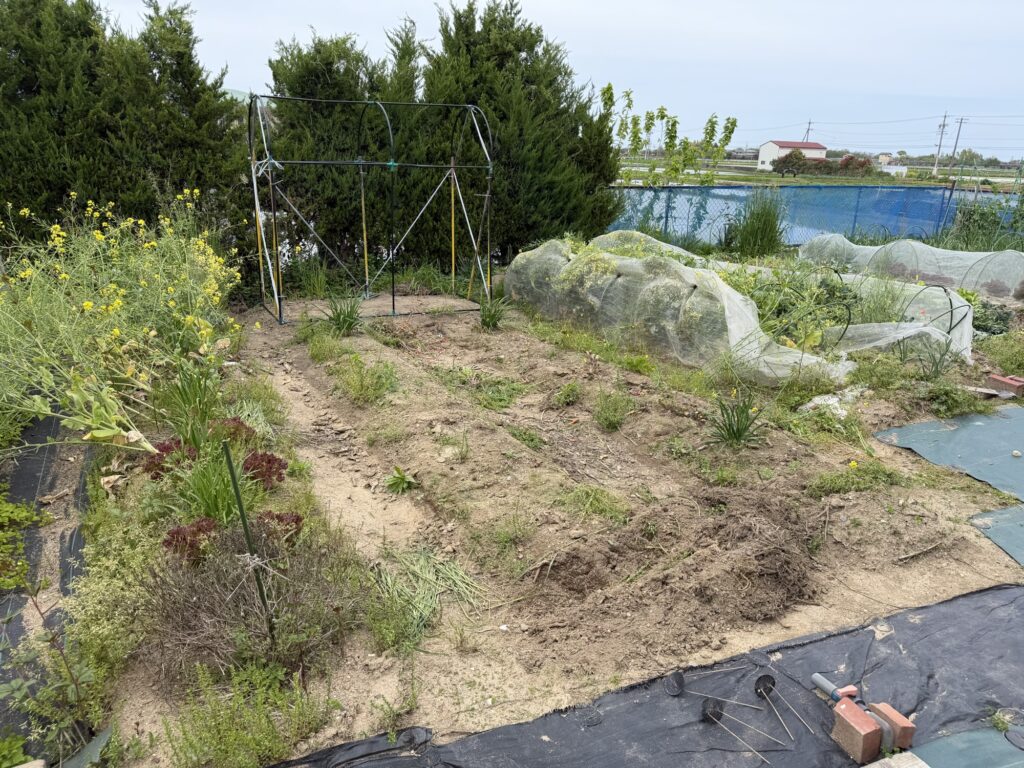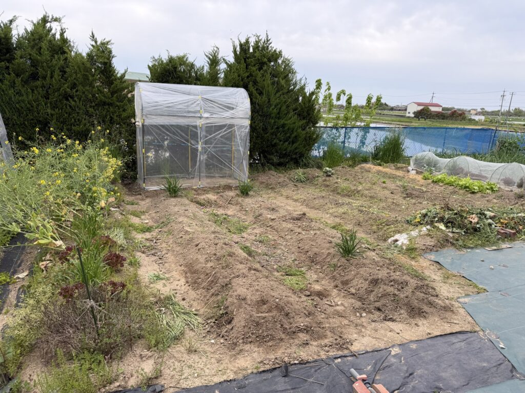 5月3日籾殻、鶏糞、牛糞、AG土力、配布、耕作、8月13日化成肥料散布、液肥散布、8月14日除草、9月9日除草、9月9日液肥散布、10月13日玉ねぎ用2畝立て、不耕起、防草シート掛け、12月31日支柱、網、不織布、設置、3月29日不織布、撤去、